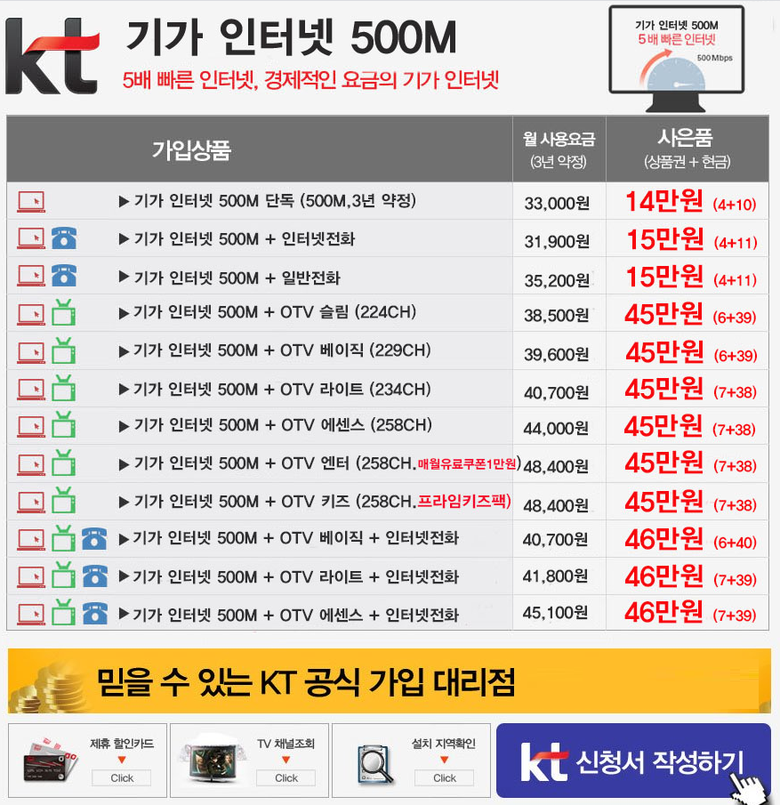 = 500M + tv베이직(UHD2) : 42,900원 / 사은품 총 42만원 / 설치비 38,500원