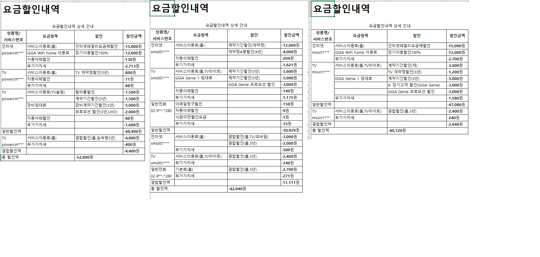 3) 위에 말씀드린 것처럼 어머님계정으로 로그인해서 뜨는 명세서 3개의 할인내역을 모두 캡쳐해서 올립니다.