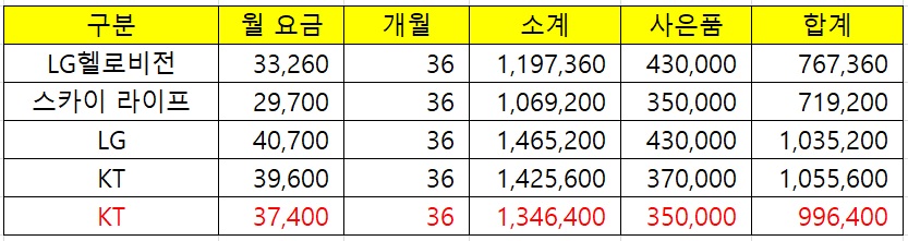 * KT : 월요금 39,600원 / 사은품 총합 37만원