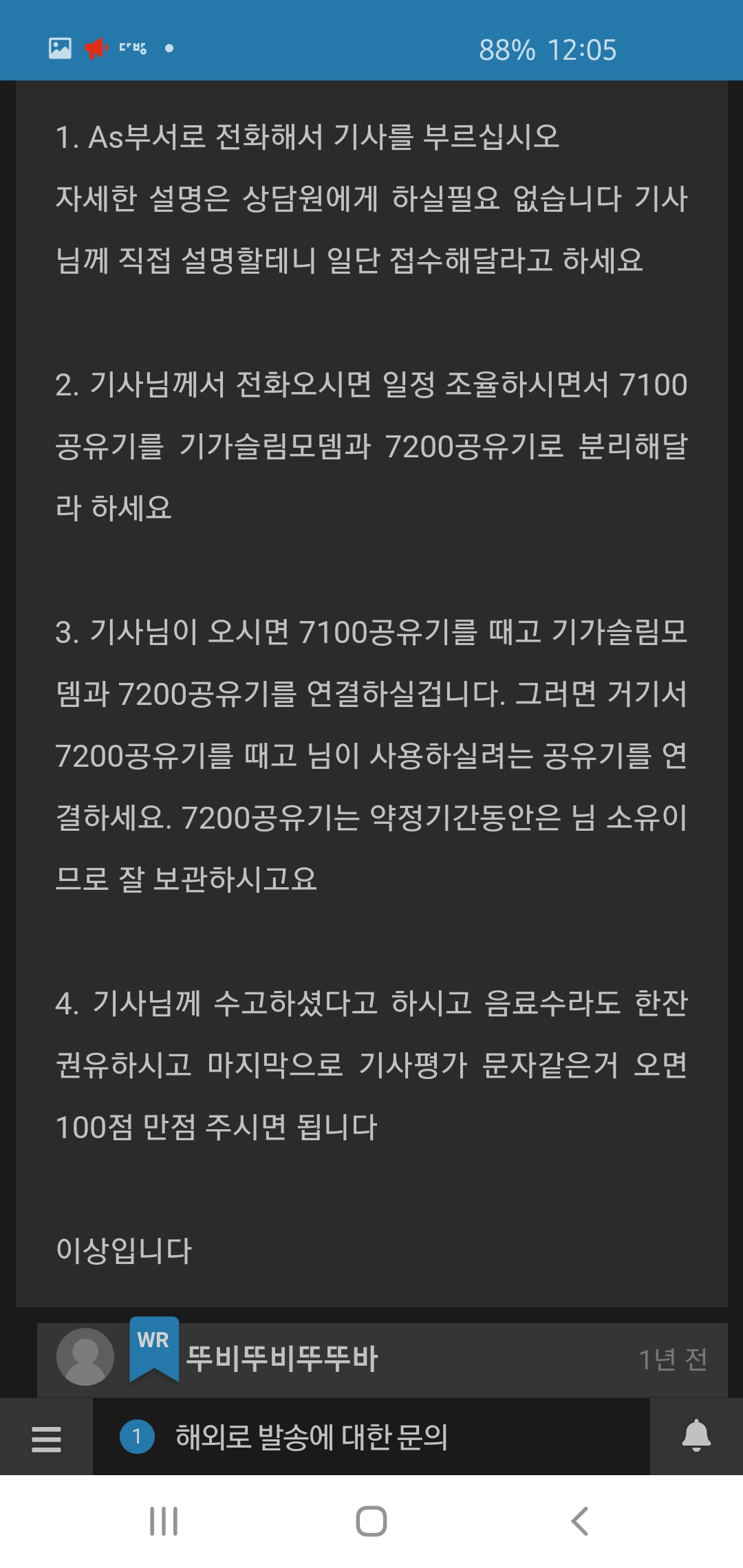 여튼 덕분에 걱정 없이 기사님 올 때까지 기다리면 되겠네요 ㅎㅎㅎㅎ 저도 유선 속도는 나오는데 무선 속도가 안나온다길래 의아했는데 고민안해도 될 것 같아요.