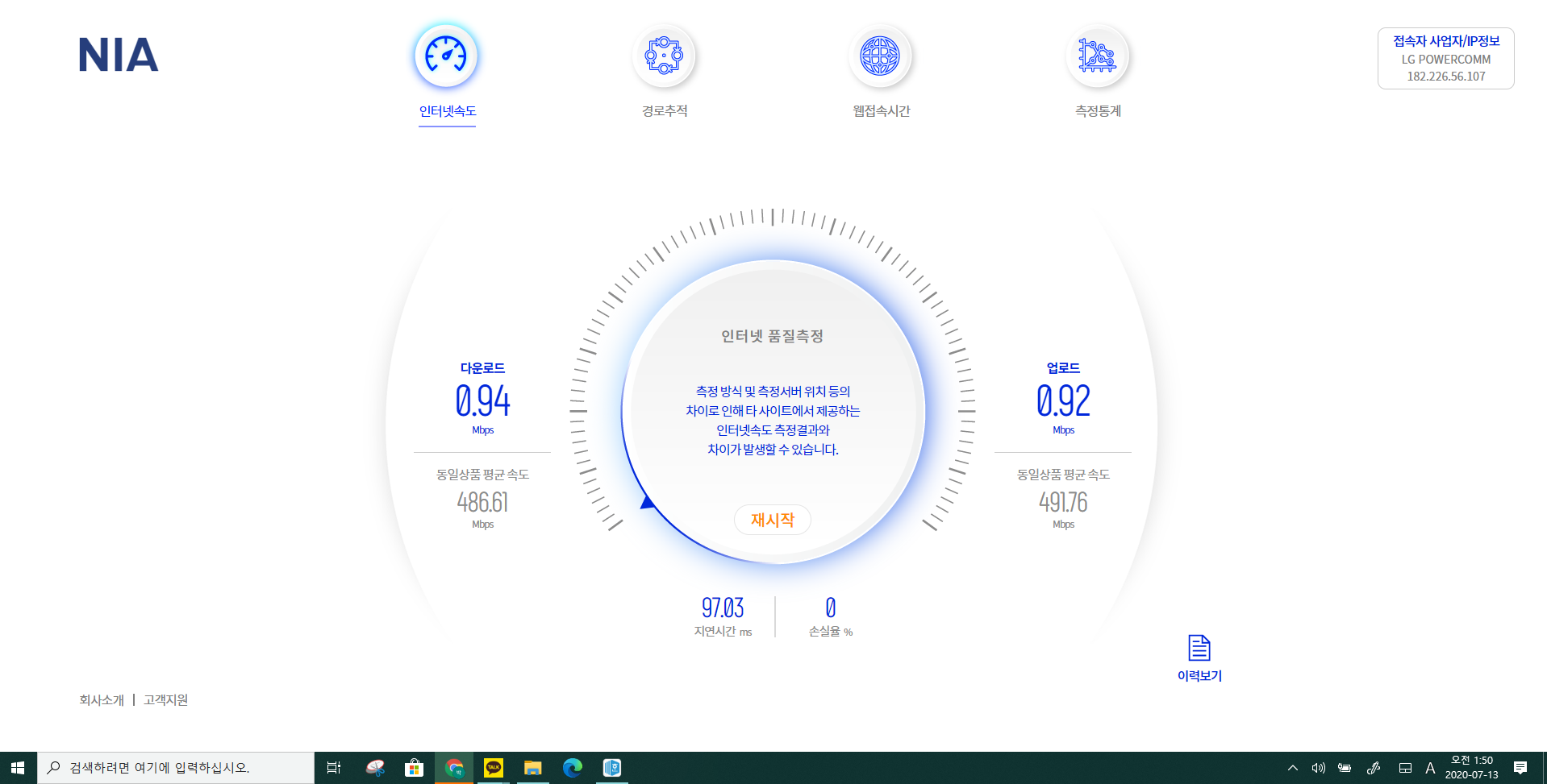 (모뎀과 PC 사이에 공유기가 있다면 모뎀 <-> PC를 직결해서도 측정해주세요~)