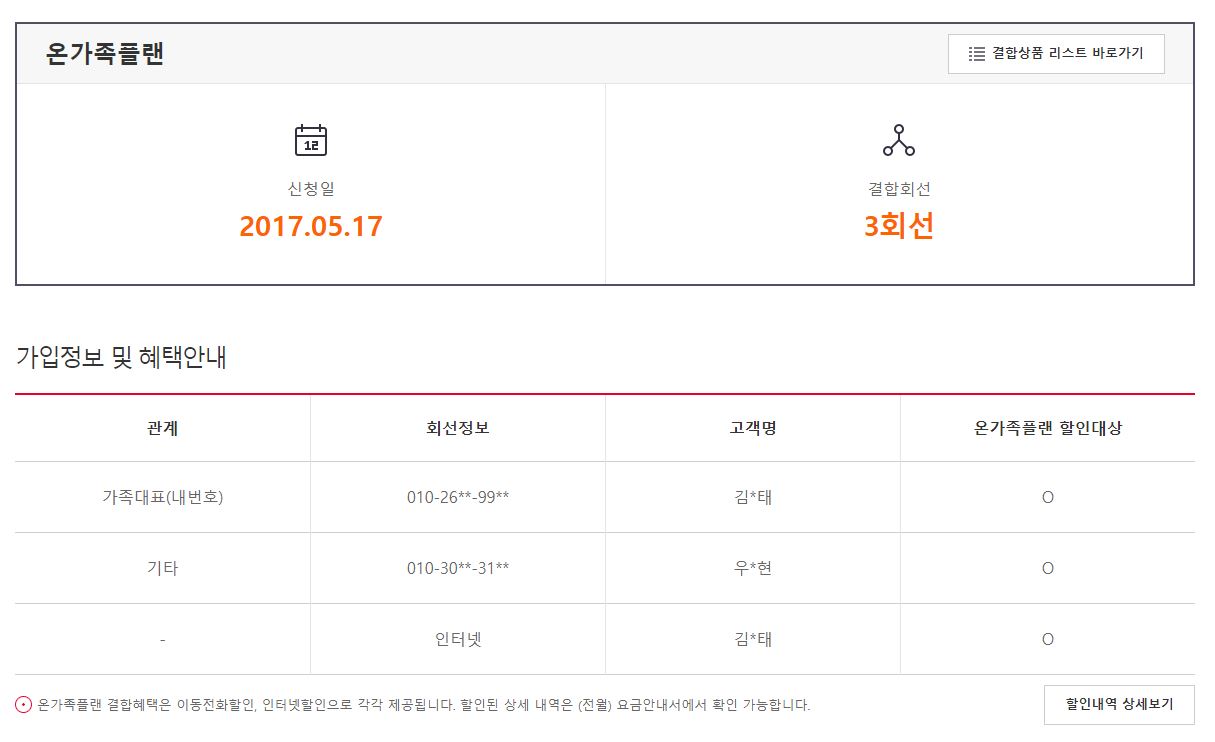 온가족플랜이고, SKT 휴대폰 2개랑 인터넷 1개(SKB, 100MB) 가 결합되어 있습니다.