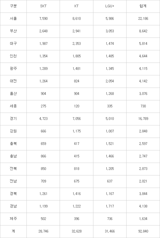 이외 지역과는 기지국 수 차이가 꽤 많이 납니다