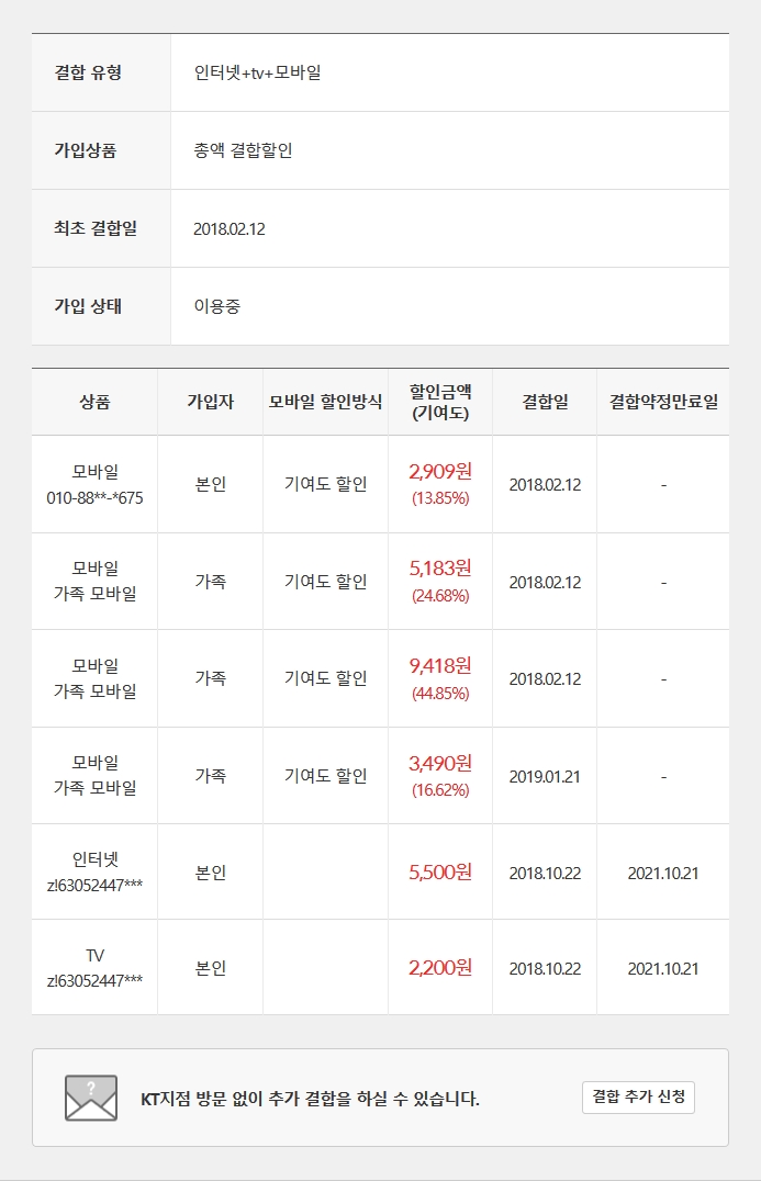 총 4명의 KT가 가족결합으로 묶여있고, 처갓집도 KT 인터넷+TV를 묶어서 사용하고 있습니다.