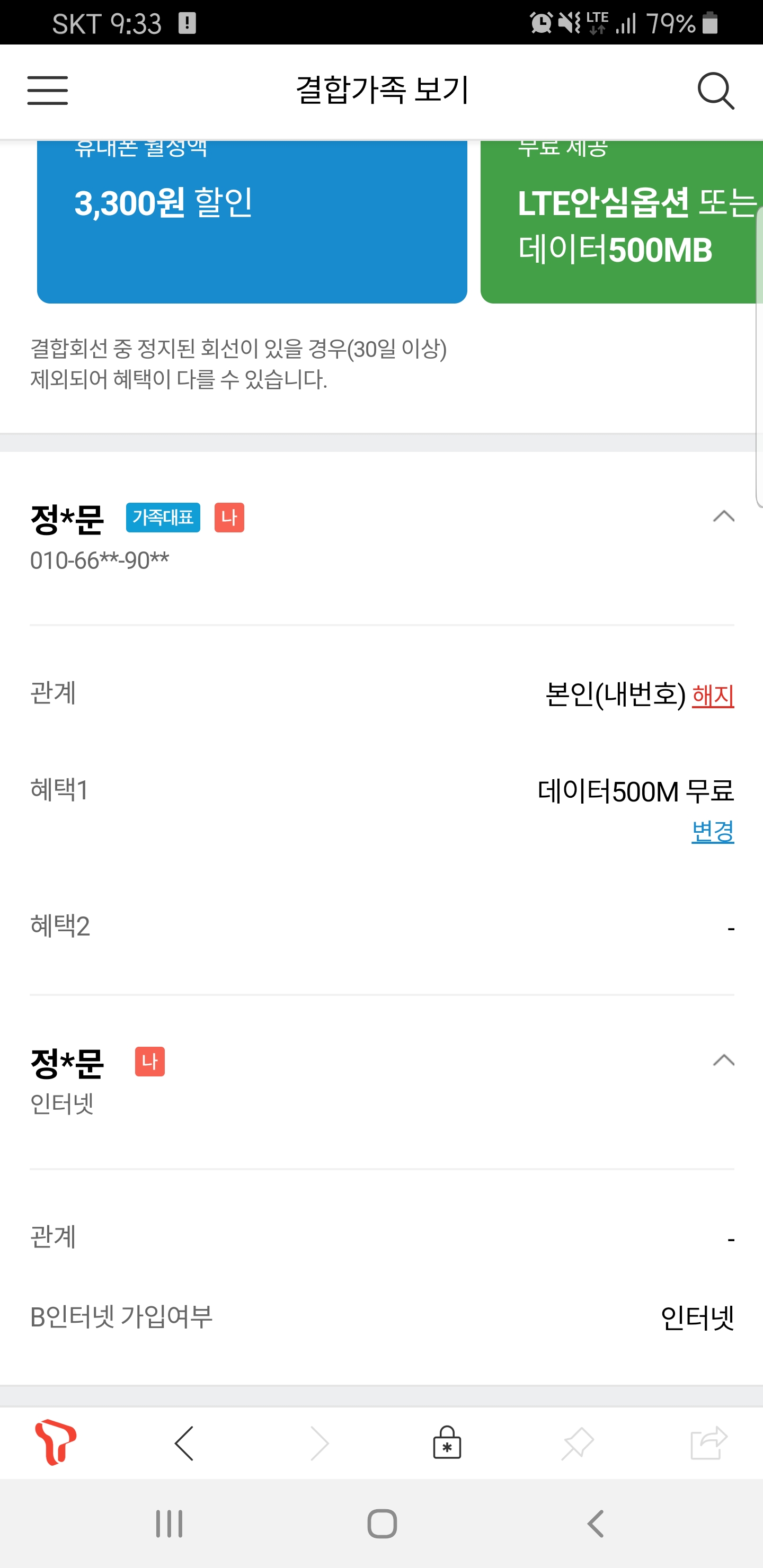 1. 현재 집이 두채인데 다른집에서는 이미 sk인터넷을 이용중이라서 제명의 폰으로 인터넷요금할인이 적용되어있습니다.