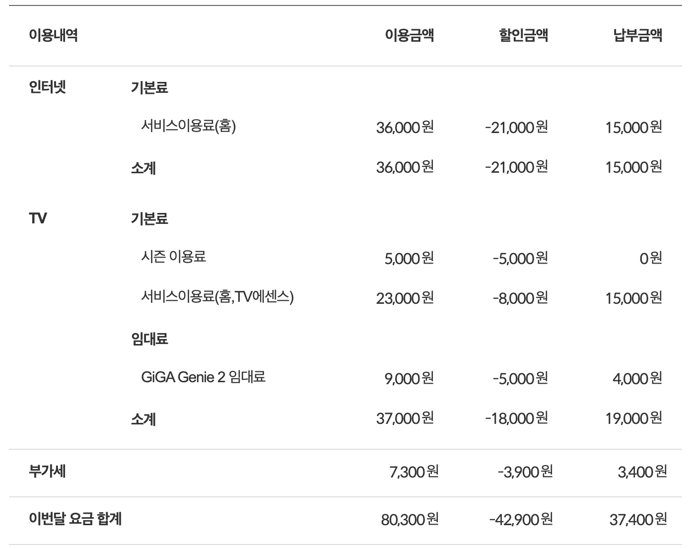 나중에 가입한 TV에센스의 요금 고지서 캡쳐해서 공유 드립니다. 두 상품 차이를 보니 인터넷 기본료에서 5천원을 추가로 할인 받고 있네요. 패밀리 결합 때문일까요?