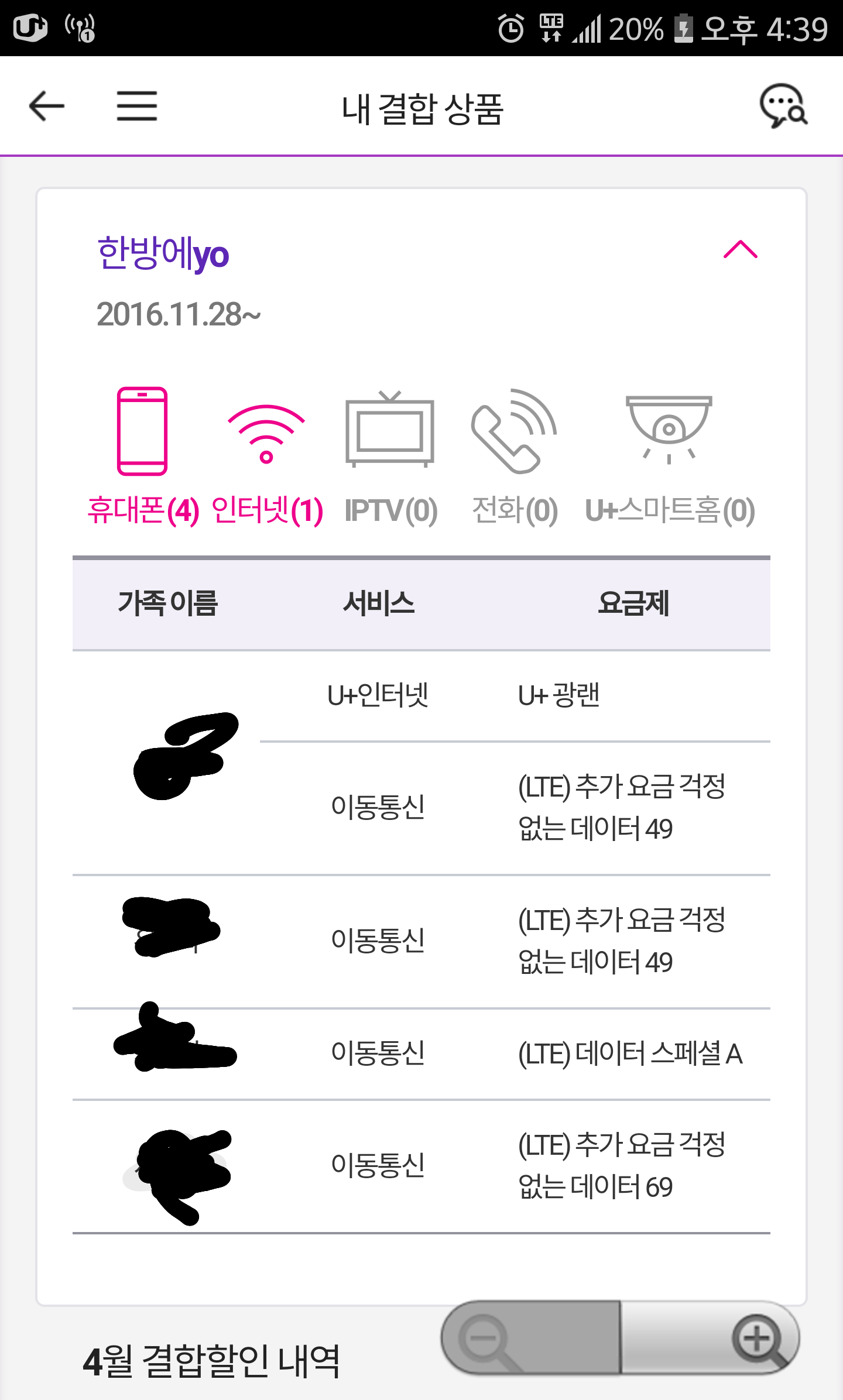현재 이렇게 사용중이고요 저(4번째)와 어머니(2번째)는 핸드폰을 바꿀 예정이긴한데 웬만해서는 lg 그대로 기기변경을 하고 싶습니다 하지만 통신사를 이동하면 더 이득이 있는지 궁금하네요(요금제는 현재와 비슷한 수준으로 유지할 예정입니다) 그리고 동생 인터넷과는 아직 결합을 하지 않은 것 같고요 제수씨는 69요금제 이상으로 사용할 것 같습니다