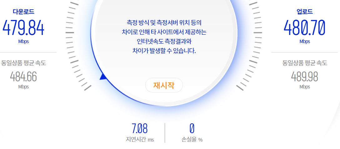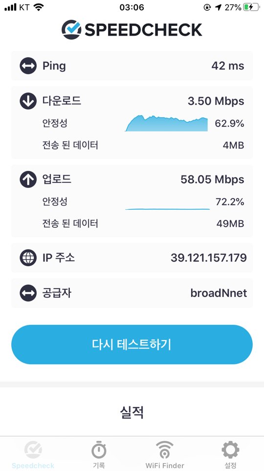 다시 속도를 측정하신 후 댓글로 다운로드/업로드 속도를 알려주십시오.