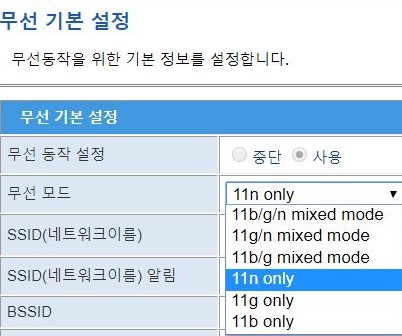 한 블로그를 보고 무선모드를 바꾸면 속도가 바뀔수 있데서