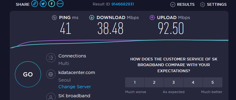 일류님 유선랜 측정결과는 반대로 다운로드가 38Mbps이고, 업로드 92Mbps 이네요!