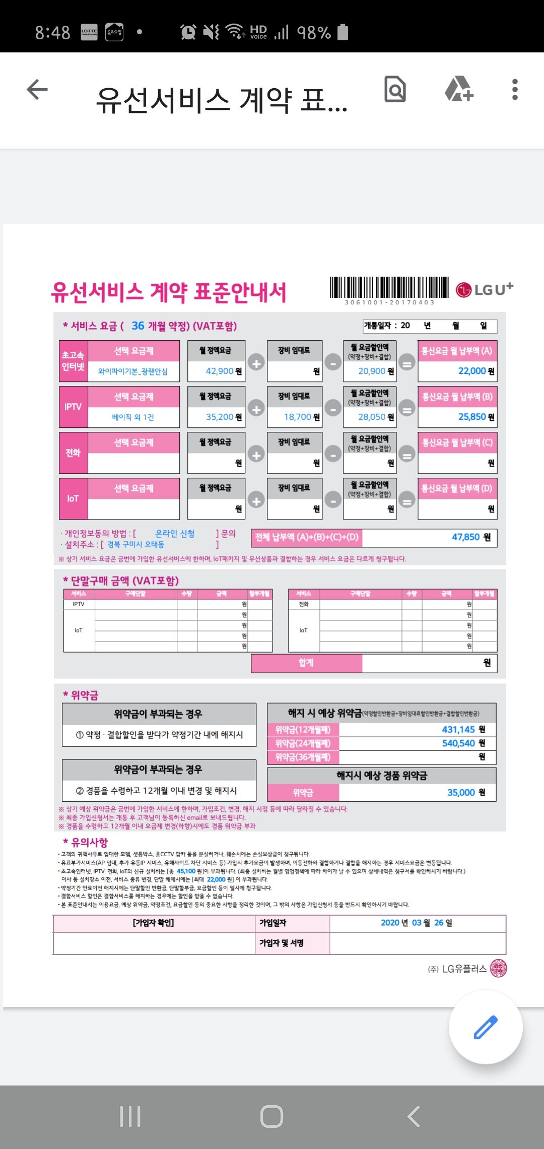 하여 LG로 가입하신다면 설치기사님께서 내방하실 때