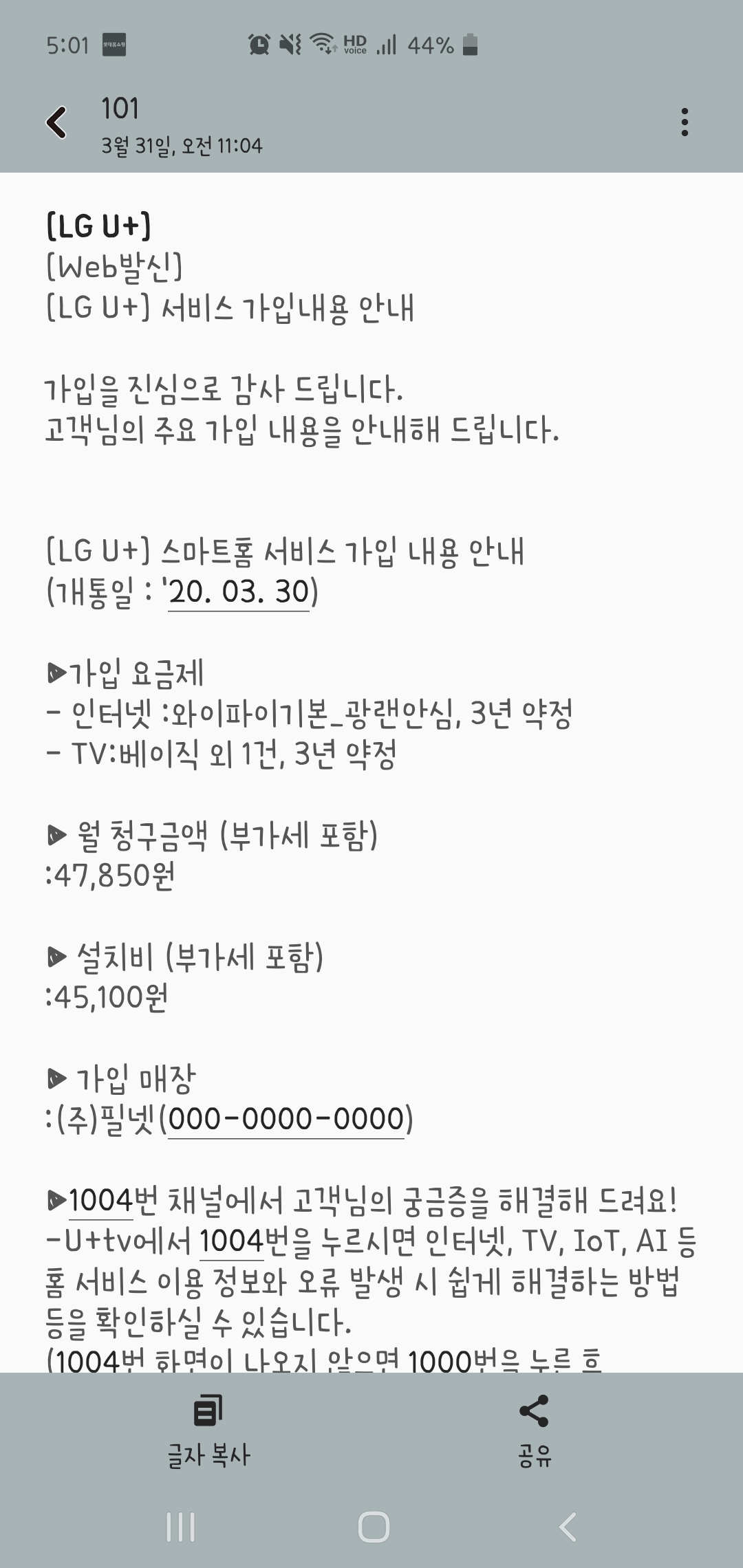 1) 그나저나 문자로 도착한 가입내용 안내에도 함정(?)이 있습니다^^;;;