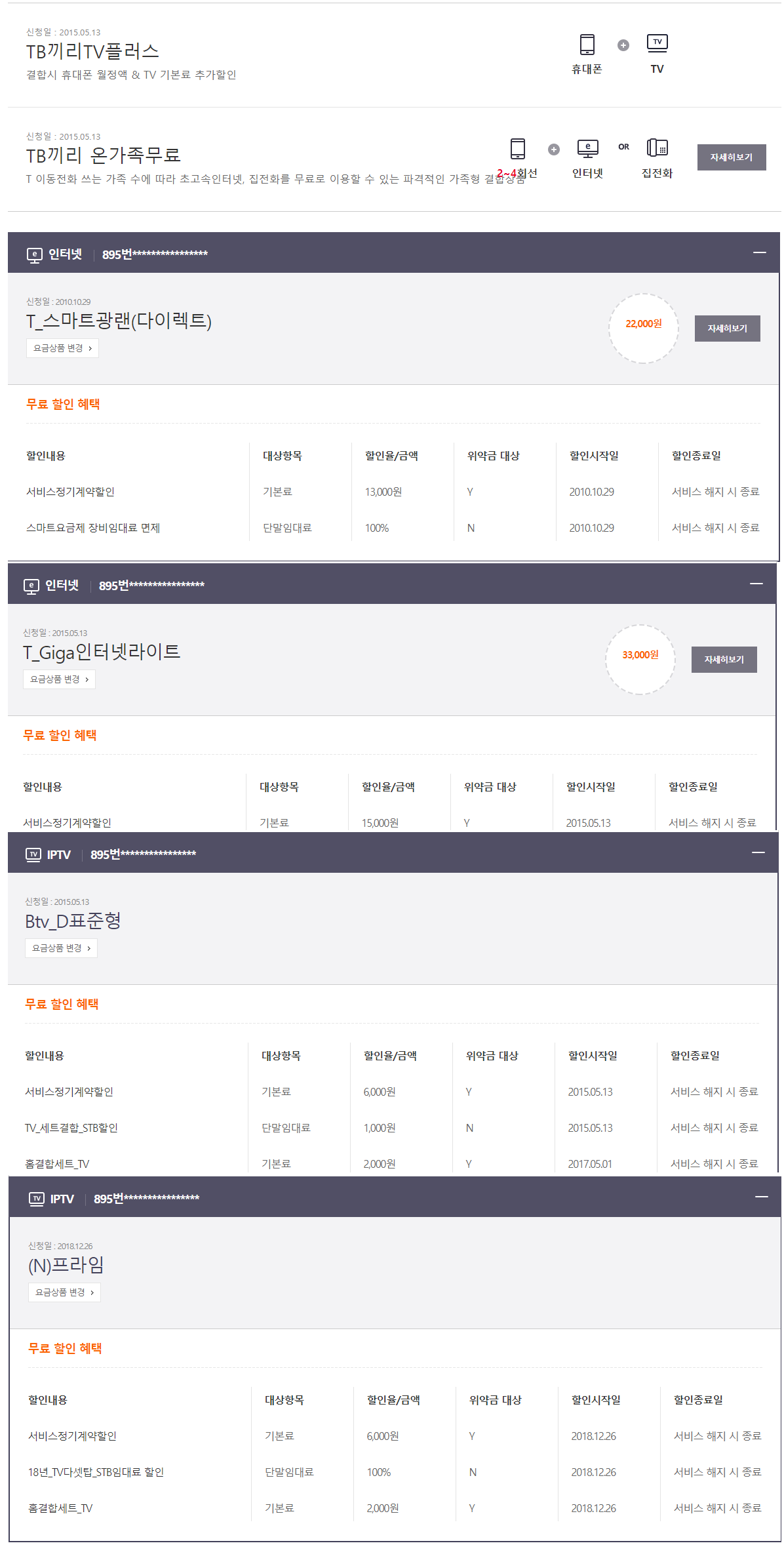 휴대폰 4회선, 인터넷 2회선, iptv 2개 가 현재 상태입니다.