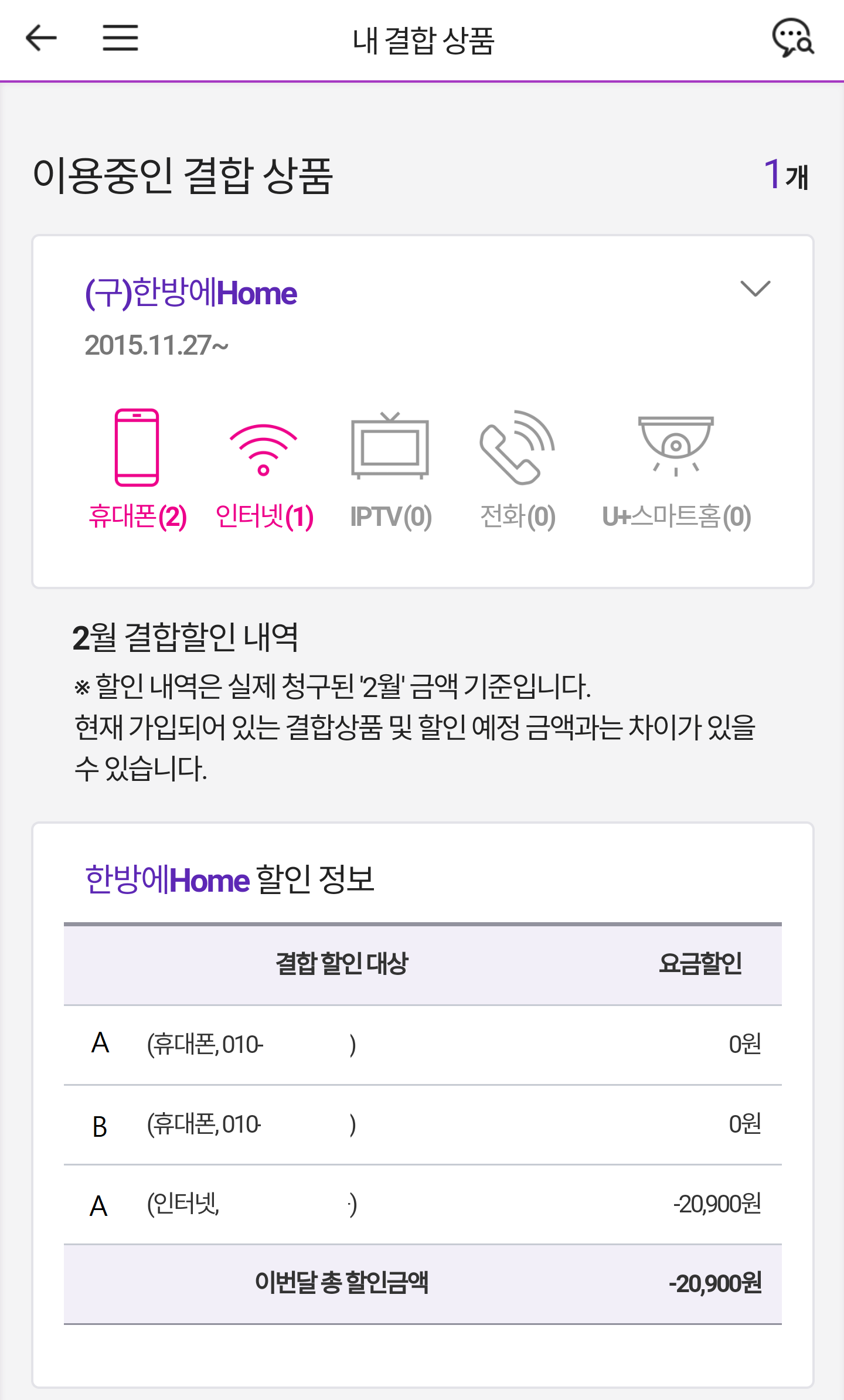 1. 현재 아래와 같이 A와 B명의로 된 휴대폰과 A 명의로 된 인터넷이 결합되어 할인받고 있습니다. 현재 A 명의로 인터넷이 3년이 훨씬 지나있습니다. 휴대폰 요금제는 둘 다 69 요금제를 쓰고 있습니다.
