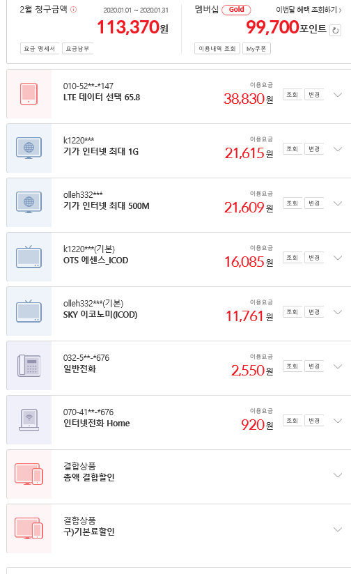 현재 사용 중이신 KT 통신 서비스 요금을