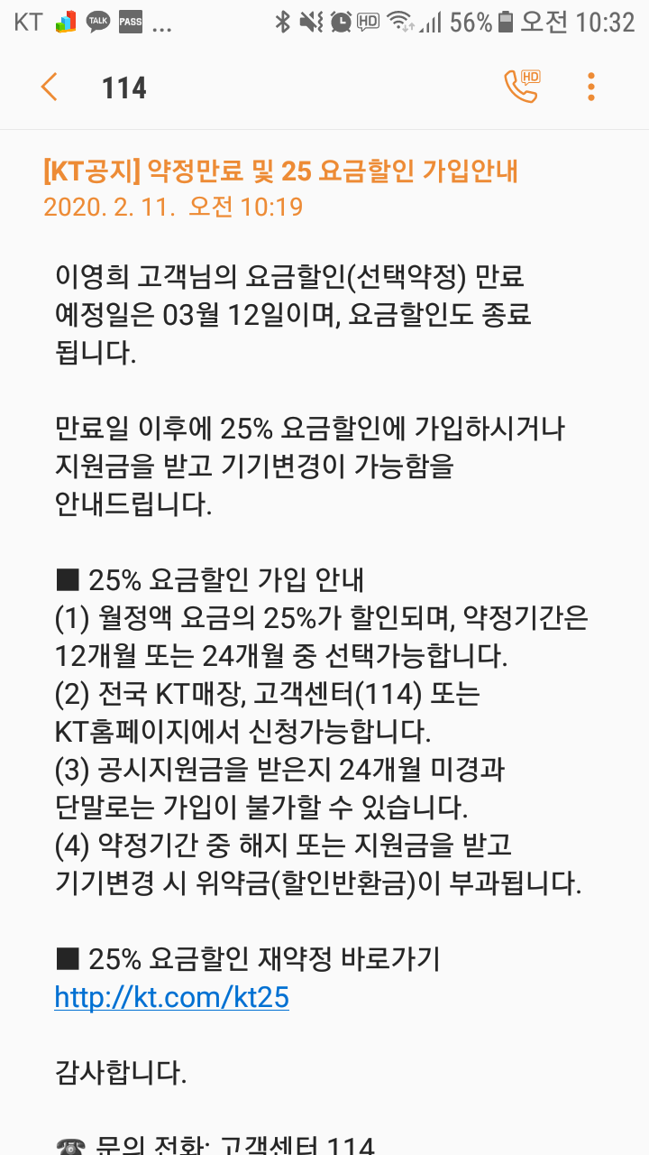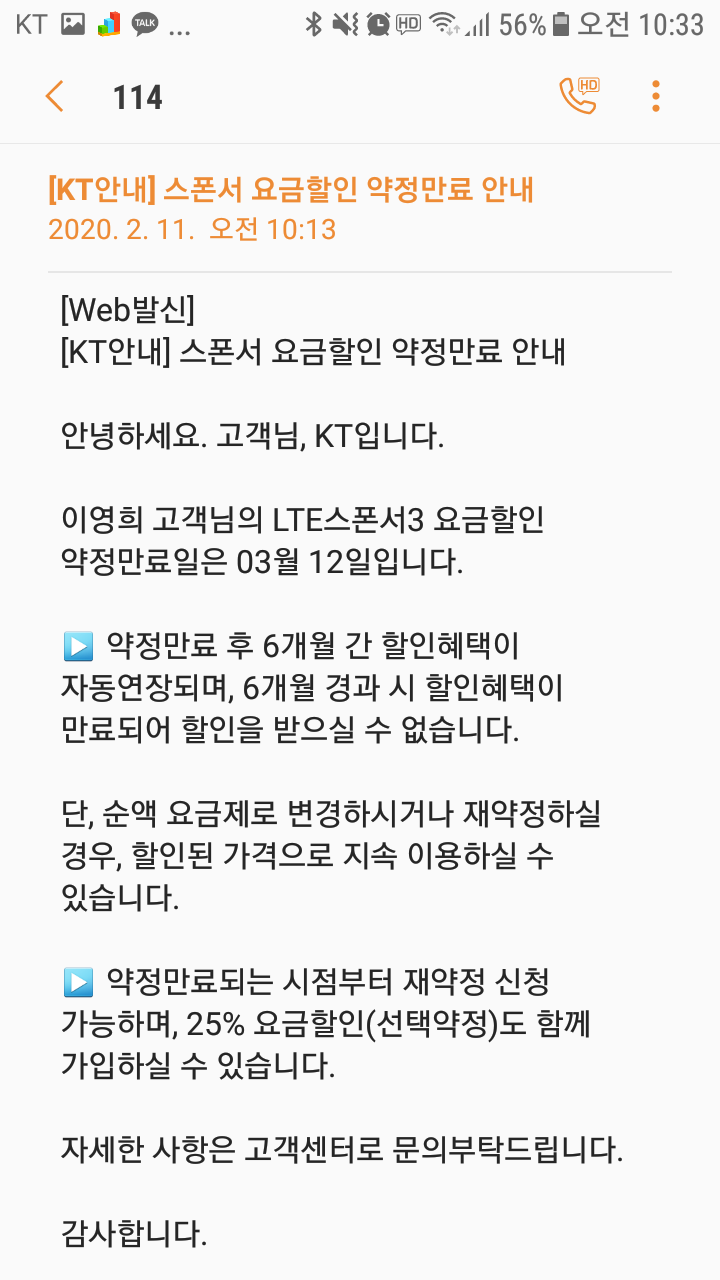 안녕하세요, 제 지인분께서 LTE스폰서3 요금할인 약정만료 안내 문자를 오늘(2020.2.11) 받았는데요.