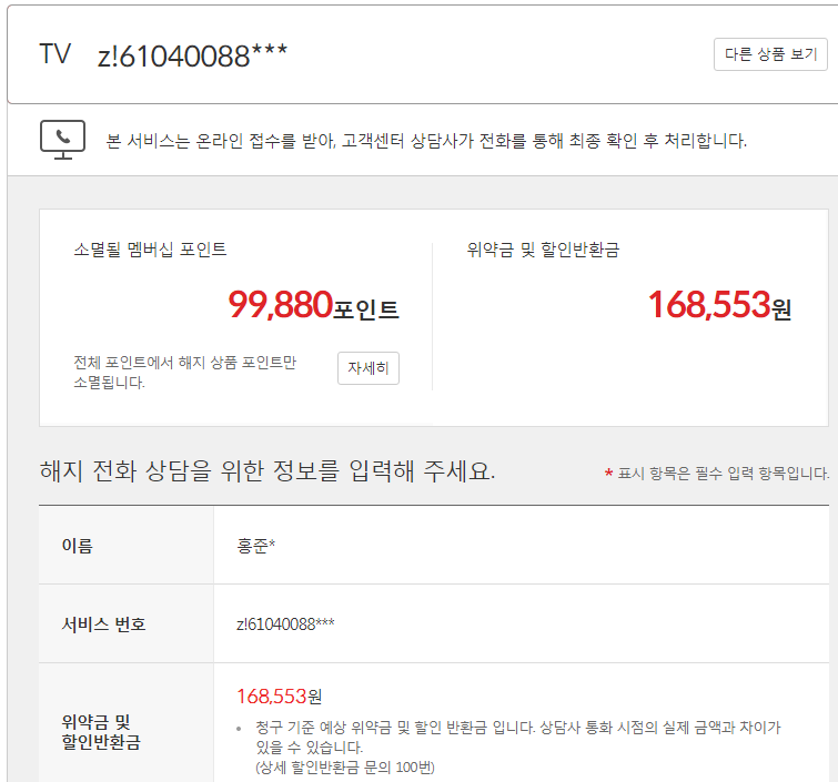 (참고로 홈페이지에 조회된 위약금은 전월, 전전월 기준이라