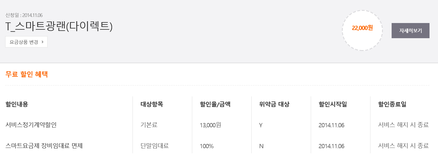 약정은 2014년 11월 6일~ 2017년 11월 5일로 끝나고 해지방어 없이 계속 이용중입니다.