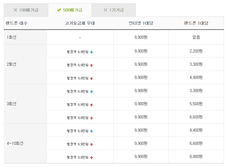 500메가에 + 휴대폰 2대이상 결합되어야 휴대폰에서도 1대당 2,200원씩 할인이 들어갑니다!