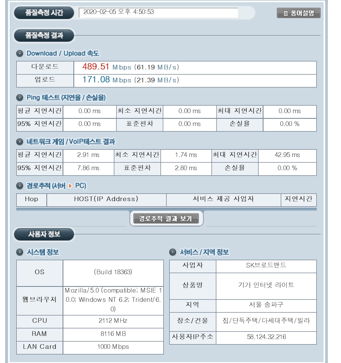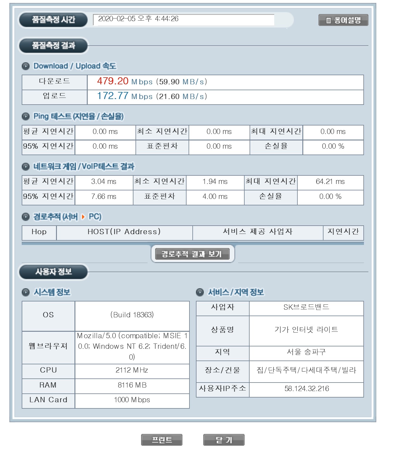 모든 서버와의 통신속도가 이와 같다는 보증은 없습니다^^;