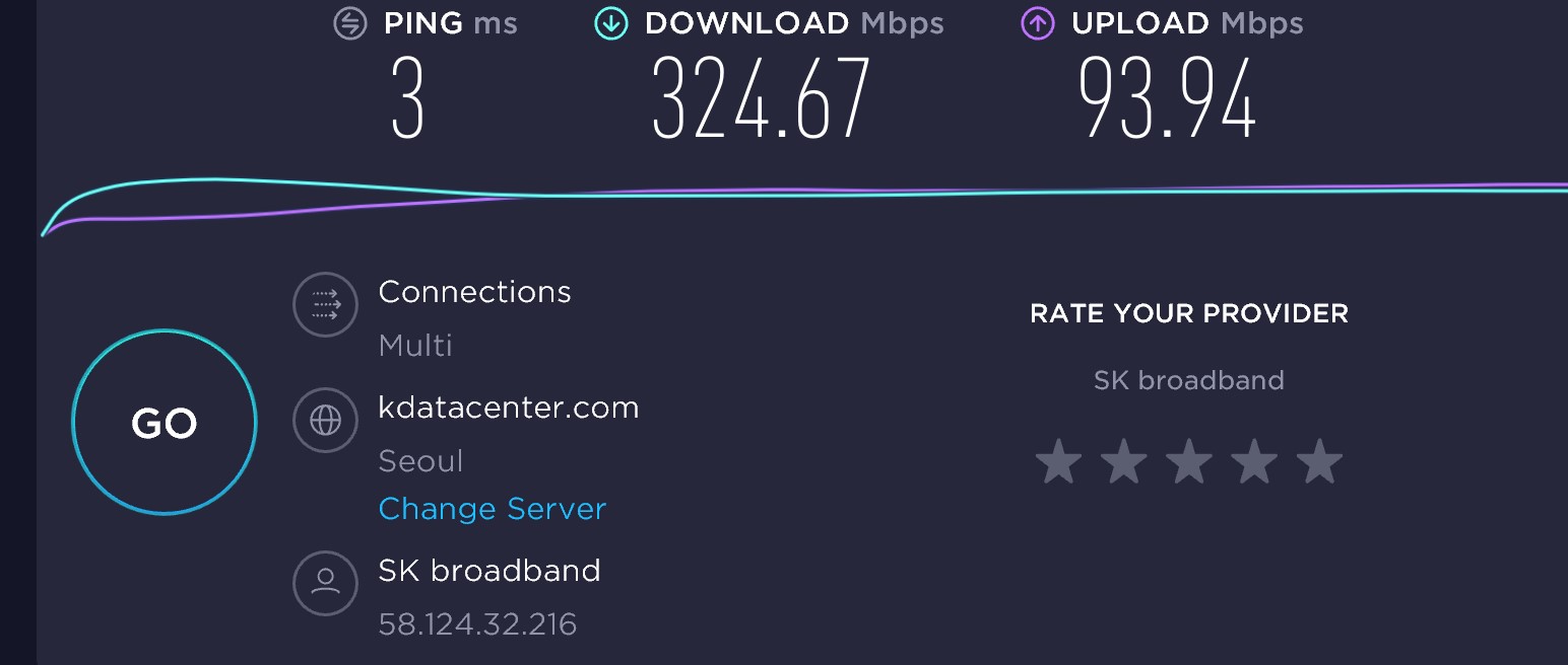 speedtest.net에서 지난 1달간 최소 20번이상 kdatacenter 기준으로 확인결과 대부분 업로드 100 다운로드 300정도 나옵니다.