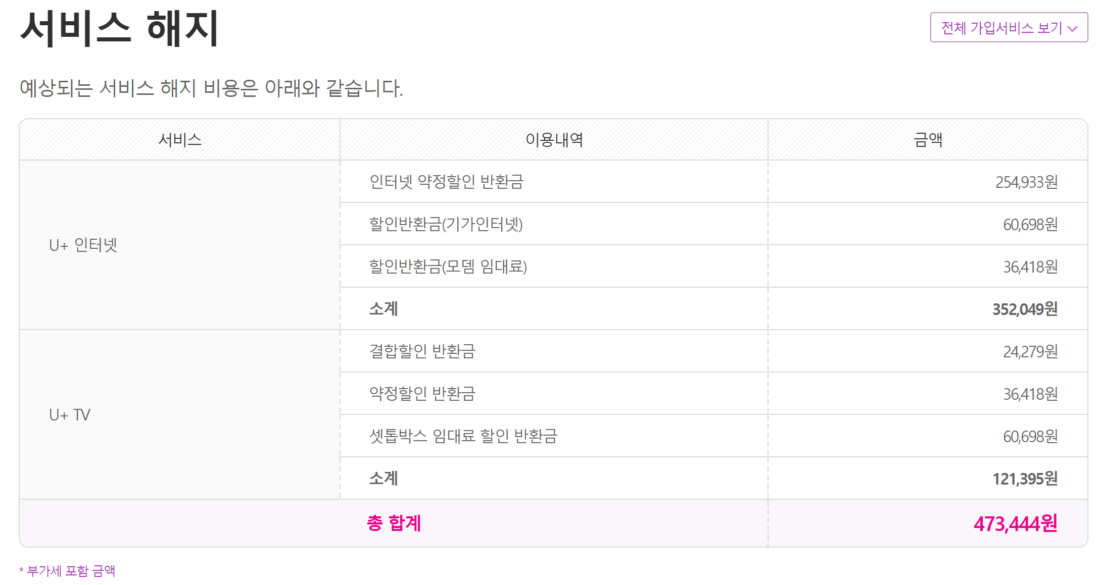 그래서 LG 홈페이지에서 조회해보니 해지시 나오는 해지비용이 저렇게 나오는데요.
