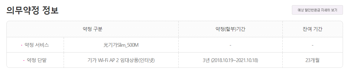 그런데 약정단말로 '기가 Wi-Fi AP2 임대상품(인터넷)' 이라는것이 3년약정으로 잡혀있고(2018.10.19~2021.10.18) 잔여기간은 23개월으로 나옵니다
