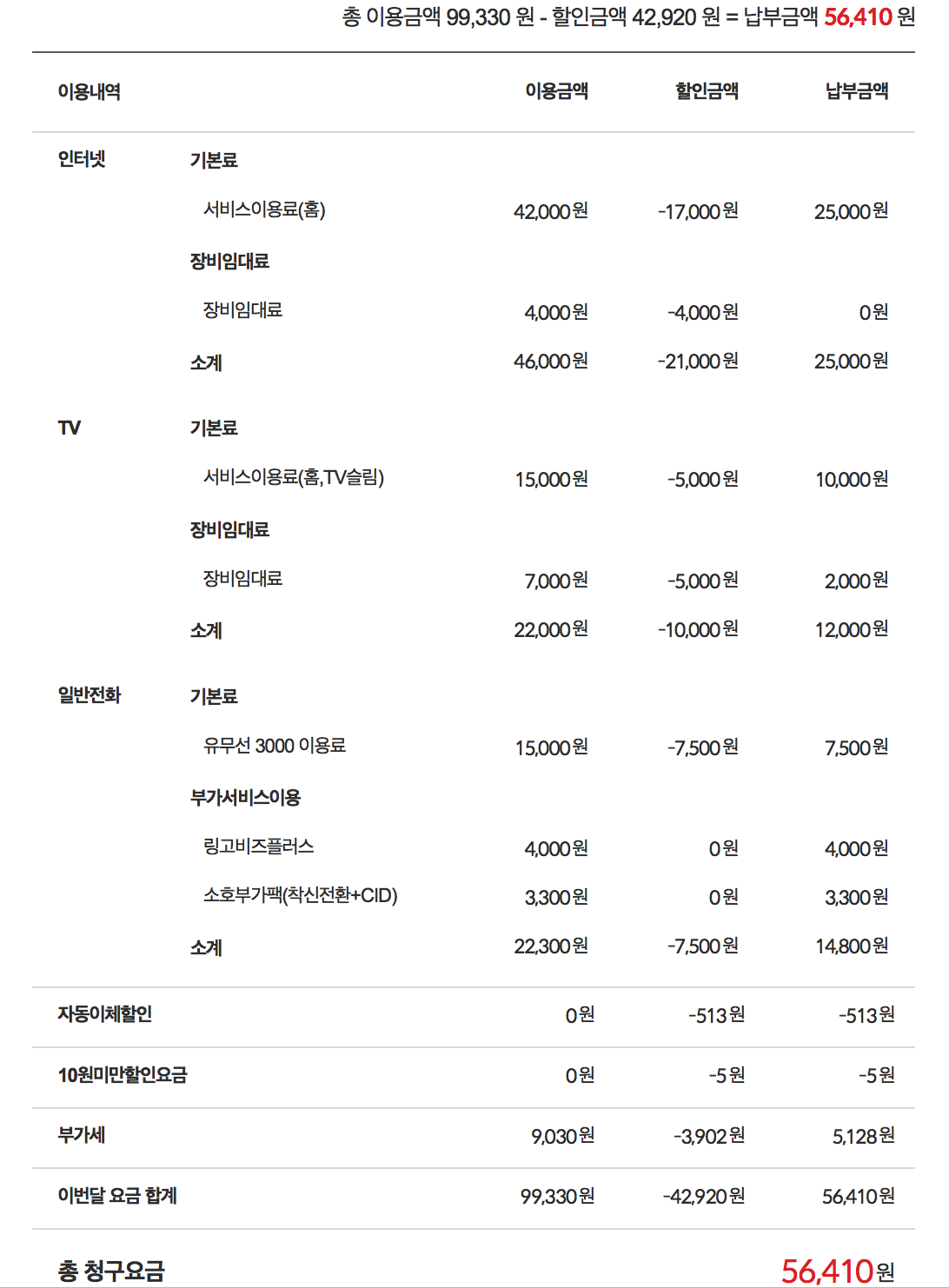 1) 인터넷+휴대폰 결합할인을 적용받지 못해 그럴수도