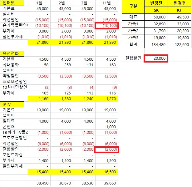 1. 인터넷 (SK 12,100원 할인 + 가족데이터 1G 제공 / KT 5,500원 할인) : IPTV 할인 포함내역