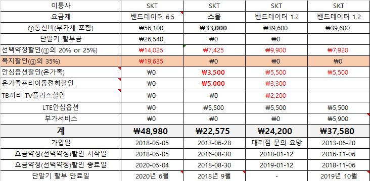 각 휴대폰 요금제와 남은 약정까지 말씀해주실 수 있을까요! ^_^