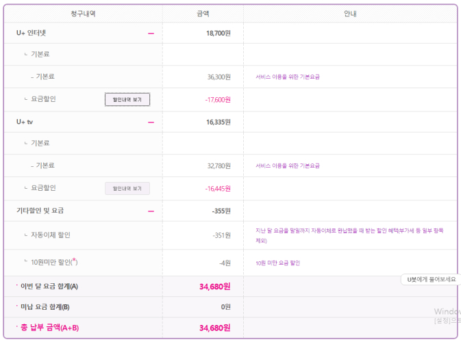 4) 설치비 : 위와 동일하게 총 38,500원이 첫달요금에 한번 합산되어 청구되어요!