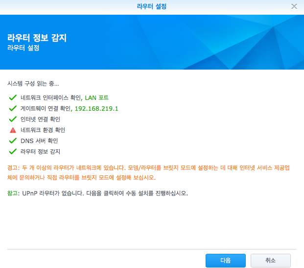 그런데 NAS에서 라우터설정하는 부분이 있는데 [두 개 이상의 라우터가 네트워크에 있습니다]라는 문구가 계속뜹니다.
