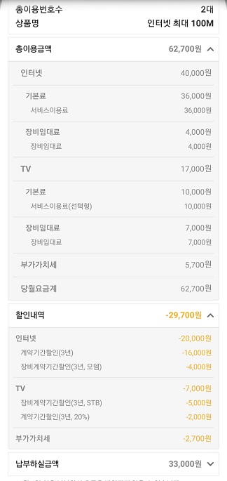 1) 부모님 댁에는 33,000원 2회선을 결합하여 총액결합할인을 받으셔야 될텐데요~