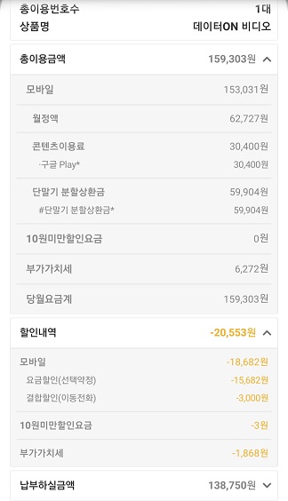 다행히 2회선을 합해서 월정액 66,000원이 되니,