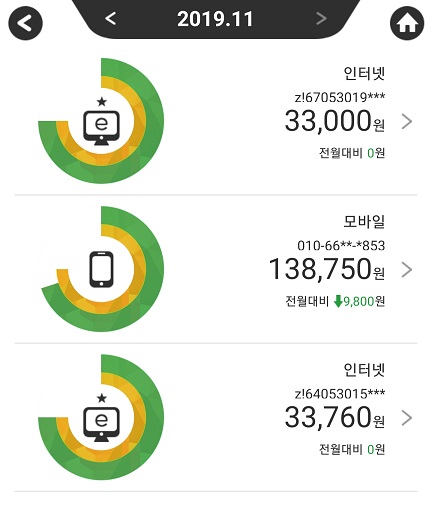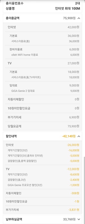 이렇게 kt 인터넷+ iptv 두 집 그리고 제 핸드폰 이용하고 있습니다.