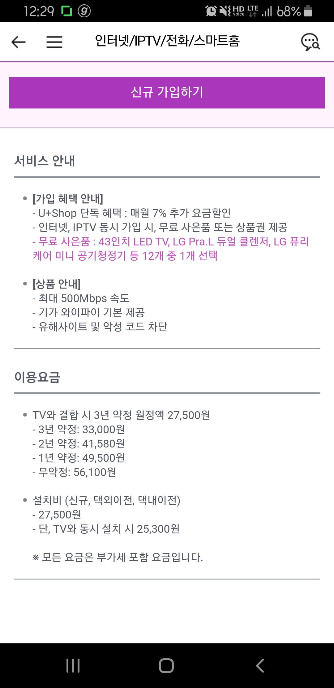 500메가 인터넷 3년 약정 기본료가 33,000원이고