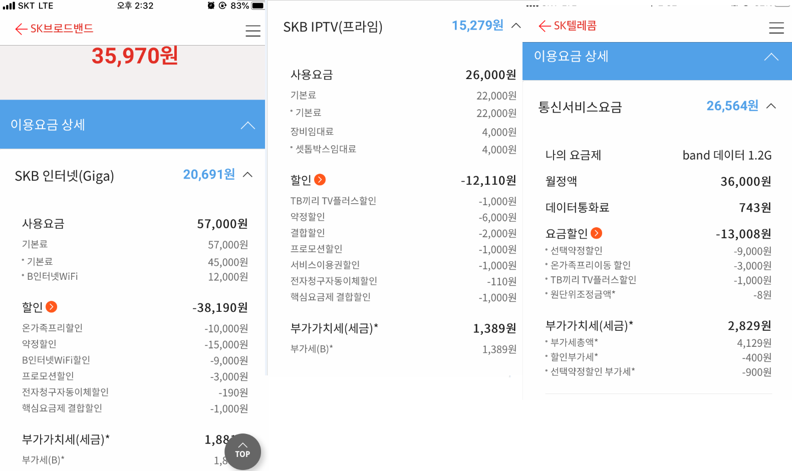 안녕하세요. 제가 sk인터넷+티비 결합상품으로 한달에 35,970원 납부하고 있습니다. sk 휴대폰은 4회선이구요.