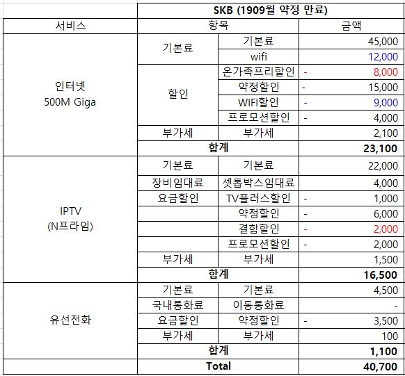 * 설치비 : 인터넷 23,100원 + TV 15,400원 = 총 38,500원 (첫달에 합산)