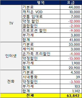 위에 정리해드린 요금은 전부 IPTV 2대 기준이고