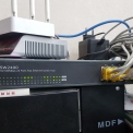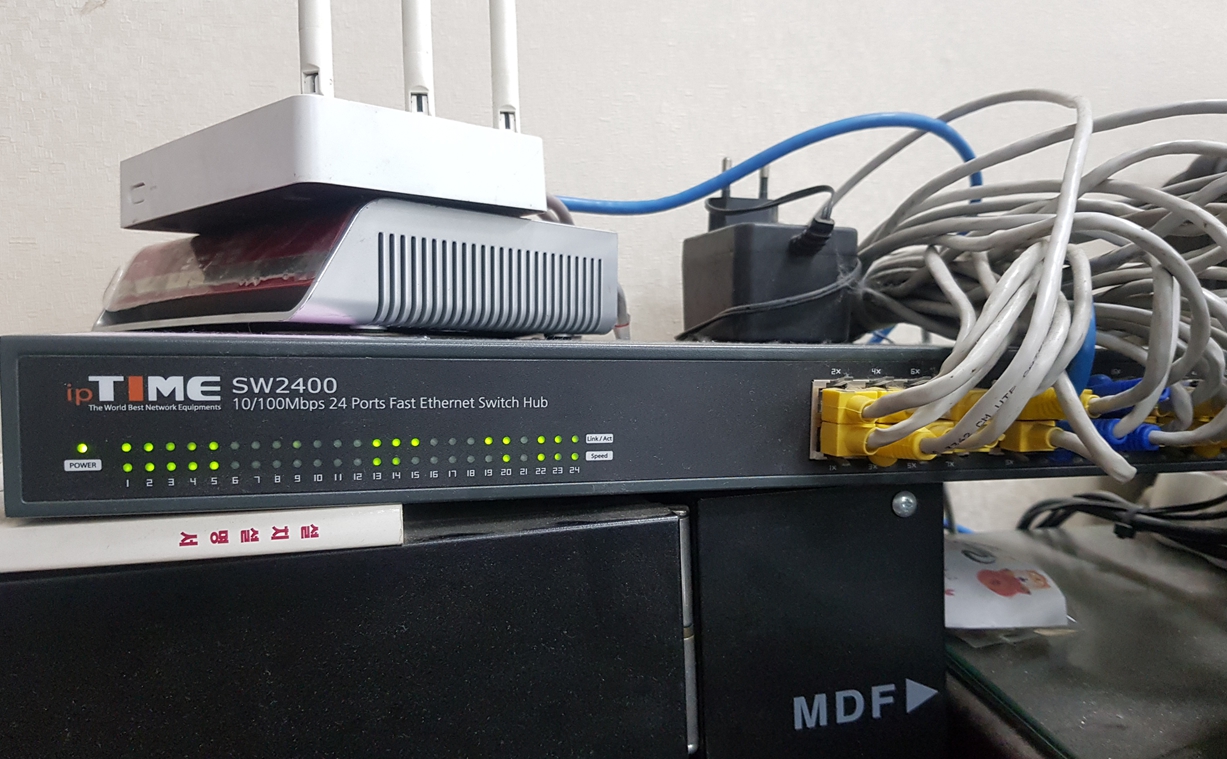 3) 현재는. 원 인터넷 선이 빨간색 메가패스 단말기로 들어와서 -> IPTIME N704BCM 으로 들어옵니다. 다시 -> SW2400 으로 가서 분배가 되는데 그 중 한 랜선이 티비 설치 장소까지 이어져 있습니다.