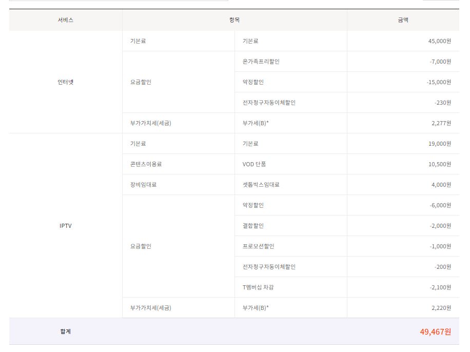 인터넷은 기가 인터넷 라이트와 btv를 쓰고, 핸드폰도 1대 연결되어 있습니다.