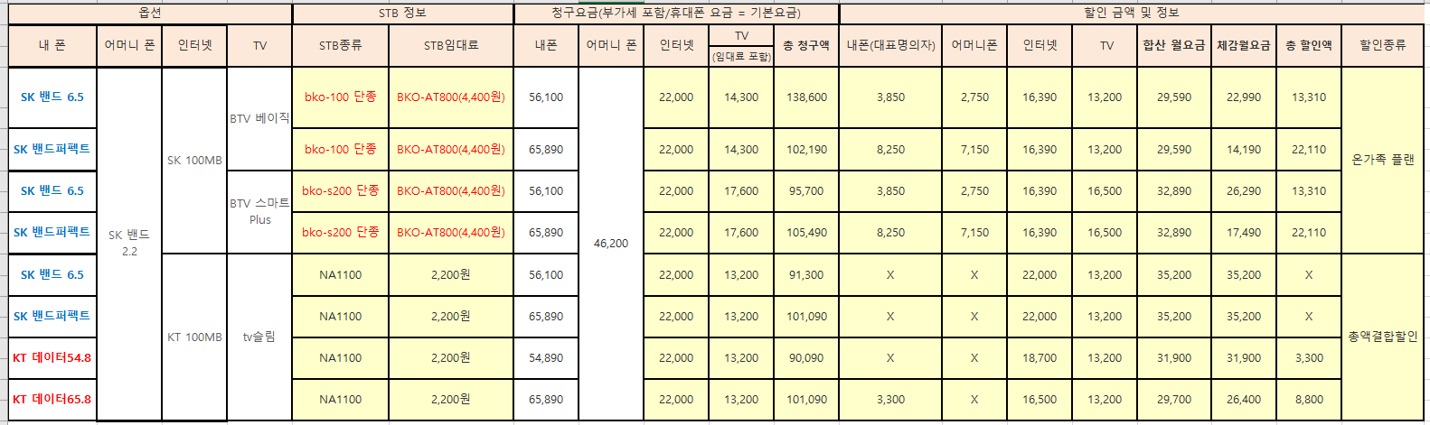 조합에 따라 다르지만 매달 월요금 차이가 1~2만원씩 나니..