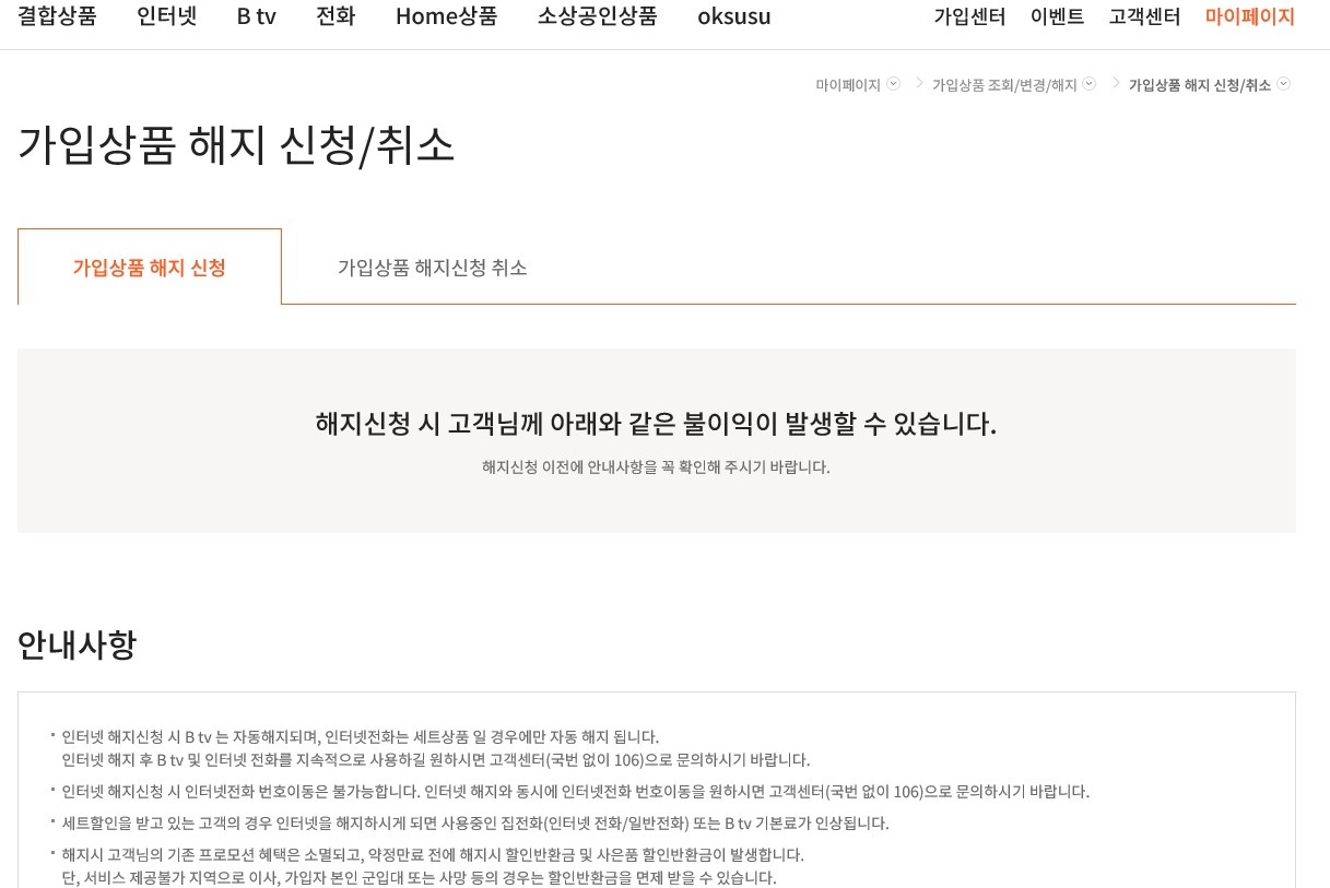 3) 아래에 주황색 버튼으로 되어 있는 '해지신청하기' 클릭해주십시요