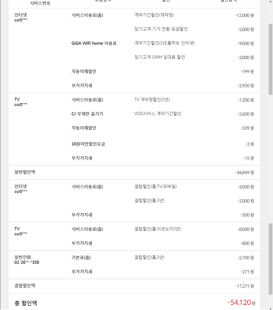 세 가지 상품 결합으로 요금할인을 받고 계셔서