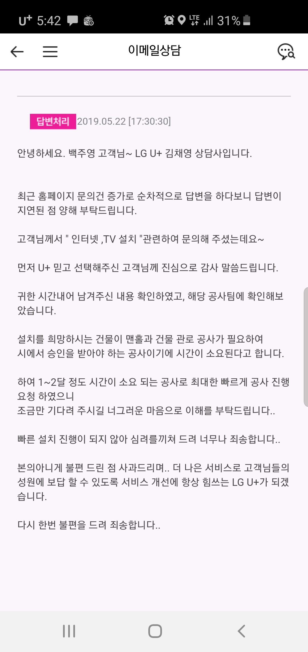 현재 LG 인터넷 설치에 어려움이 있는 상황이군요...ㄷㄷㄷ