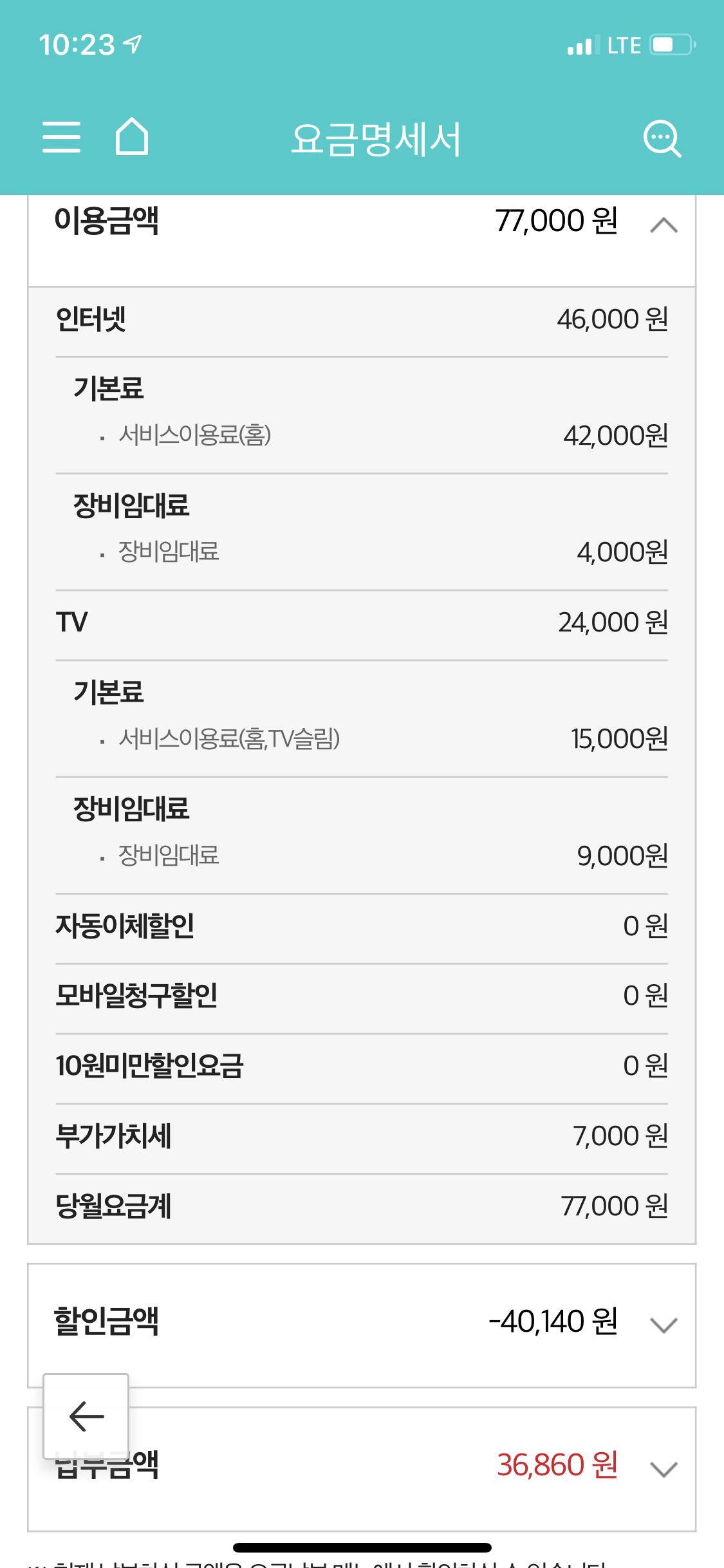 인터넷+tv는 할인받아 36860원 내고 있습니다~!