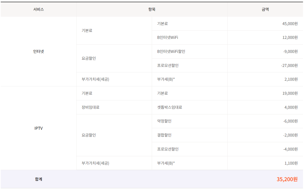 * 설치비 : 인터넷 19,800원 + TV 15,400원 = 총 35,200원 (첫달에 합산)