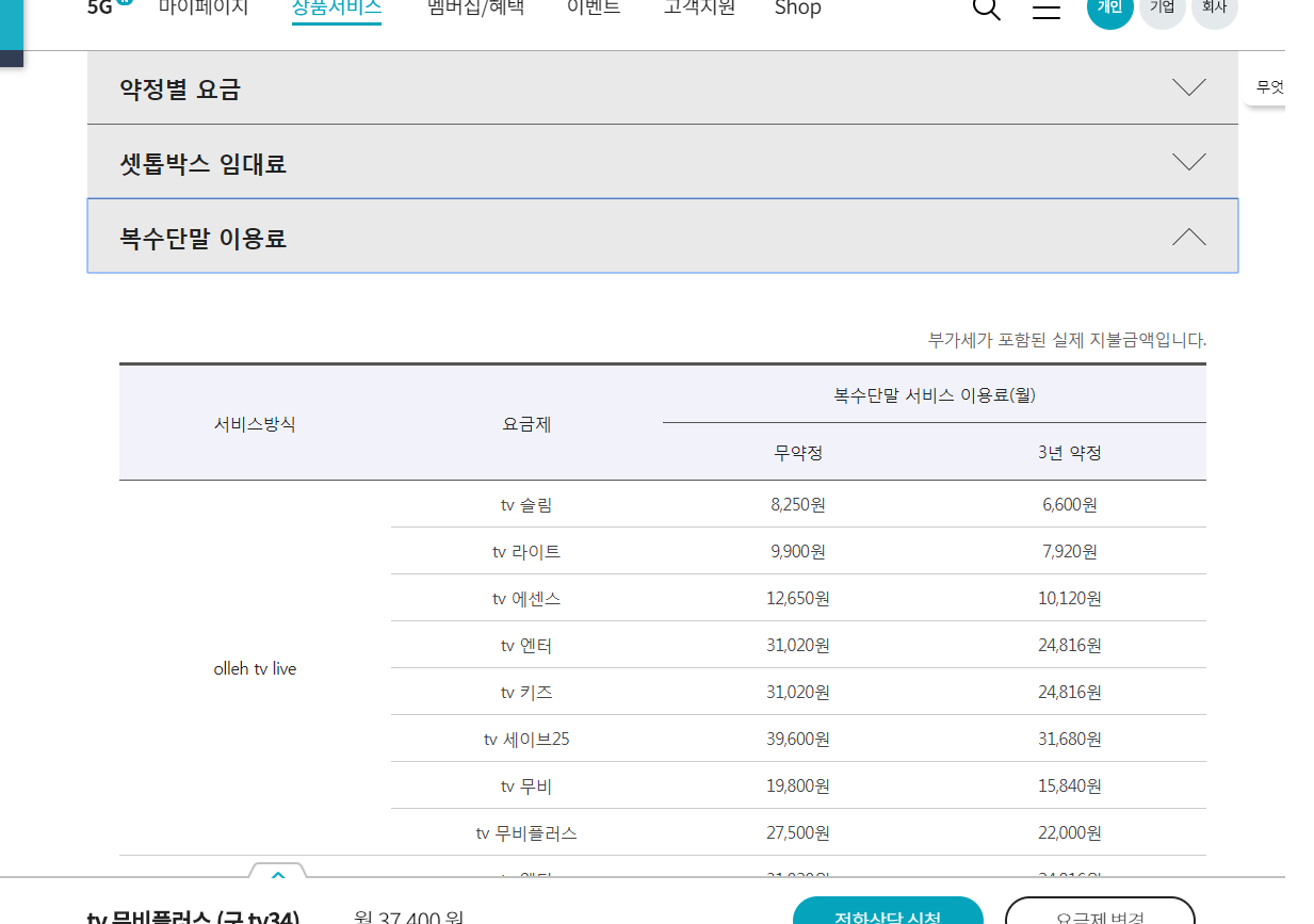 <<<<<< TV슬림 요금이라고 나와있는 표 >>>>>