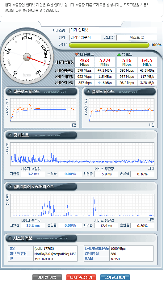 같은 한국 서버로 속도를 측정한다고 하더라도,