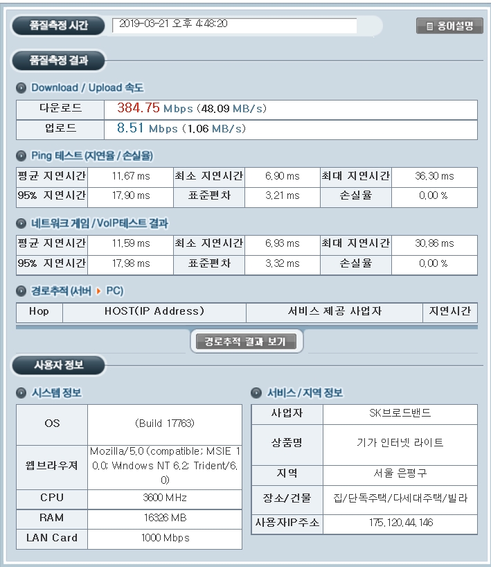 업로드과 지연시간(ping)에 대해서는 전~~혀 언급이 없어요^^;